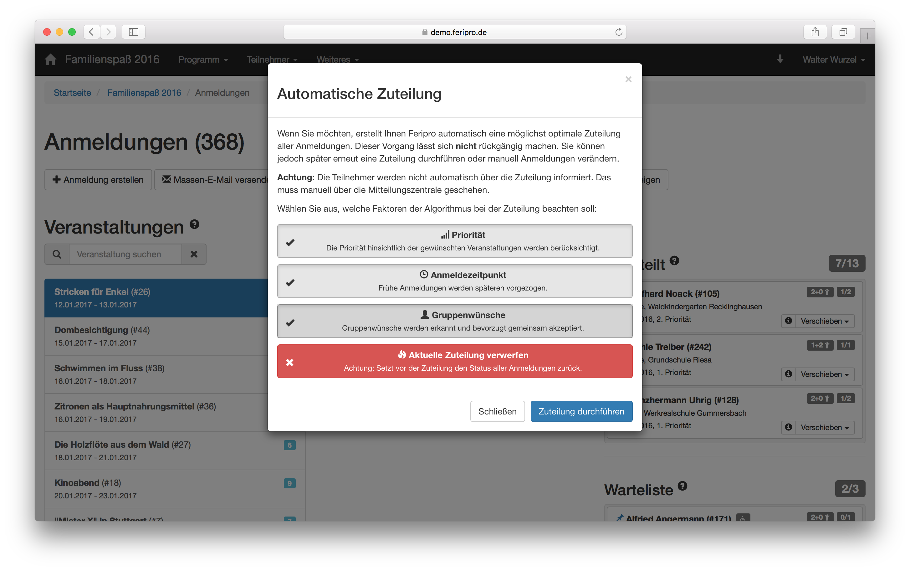 Achtung: Dieser Vorgang kann nicht rückgängig gemacht werden! Die neue Zuteilung kann nicht wieder durch die alte ersetzt werden. Wurden die Teilnehmer bereits über die Zuteilung informiert, sollten Sie die aktuelle Zuteilung nicht mehr verwerfen.
