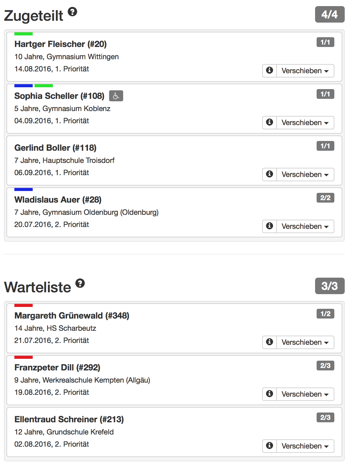 Wählen Sie eine Veranstaltung aus der Liste aus und sehen Sie nach, welche Teilnehmer den Veranstaltungen zugeteilt sind. Die Teilnehmer wurden hier schon über die Zuteilung informiert. Verschieben Sie daher die Zuteilung nicht mehr von Hand.