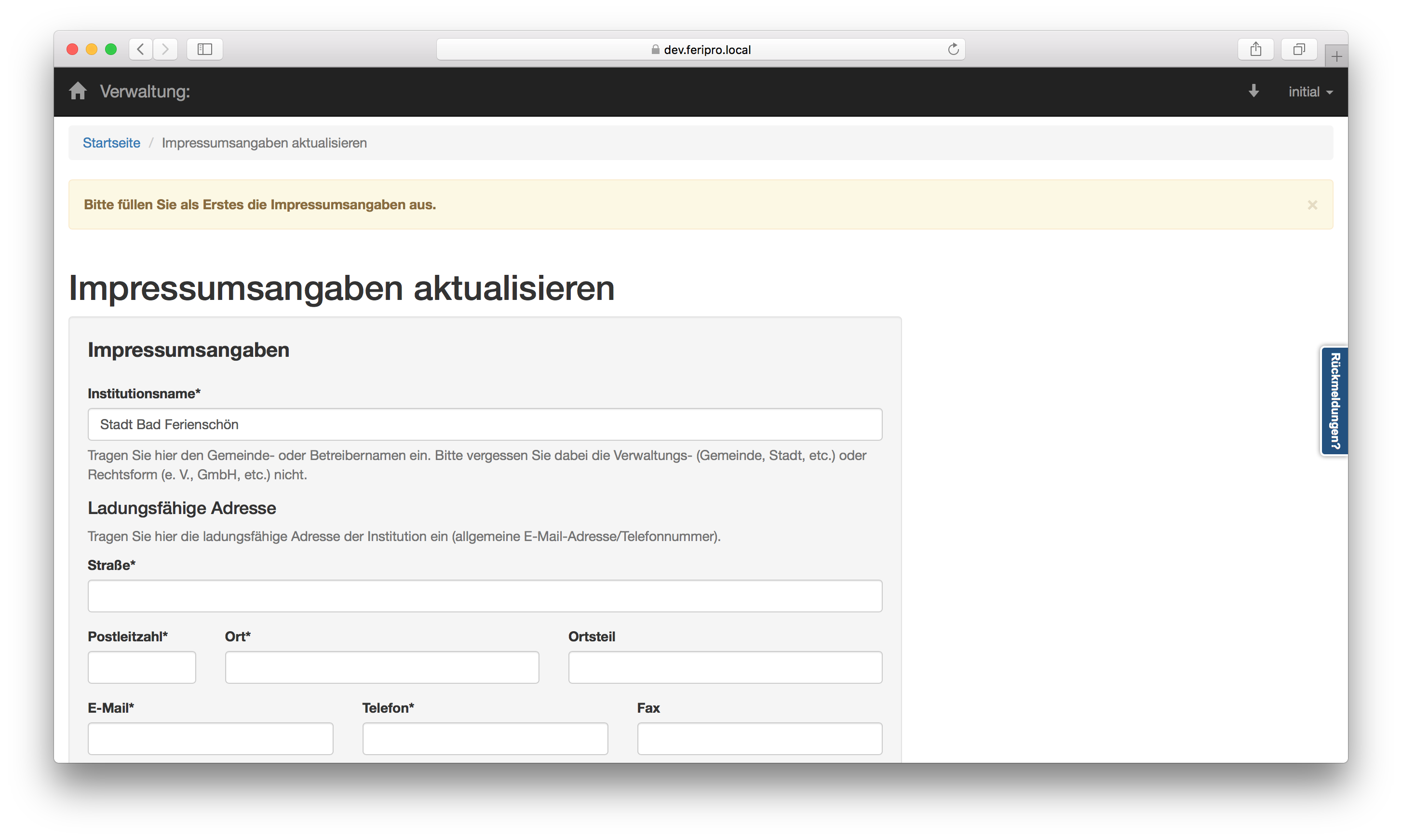 Nach Ihrer Anmeldung werden Sie mit Ihrem neuen Impressum begrüßt, das darauf wartet, von Ihnen ausgefüllt zu werden. Nachträgliche Änderungen können später in den Einstellungen vorgenommen werden.