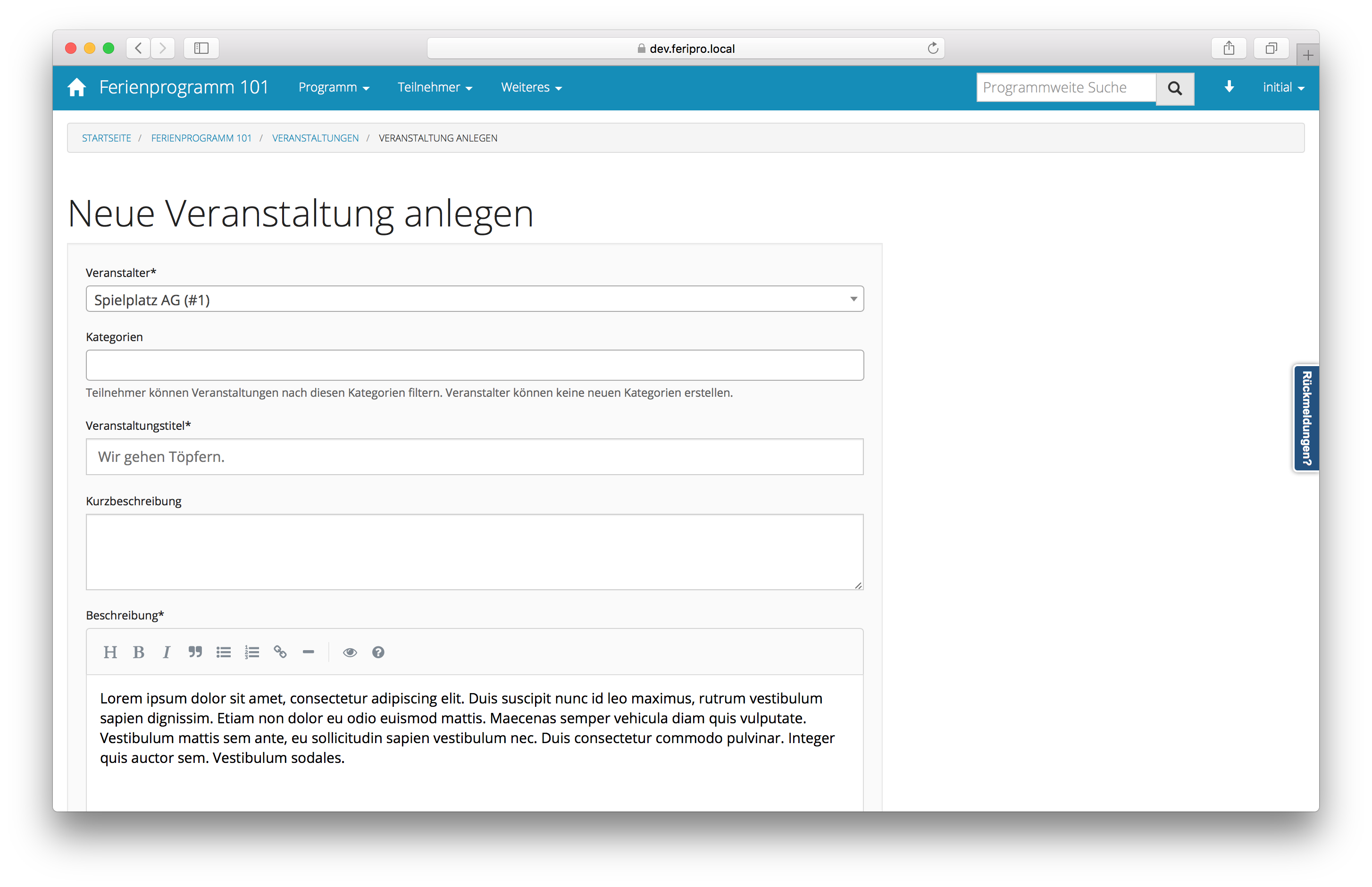Der erste Schritt für ein funktionierendes Ferienprogramm ist das Programm an sich. Wählen Sie zuerst unter der Programmübersicht das Feld: „Neues Programm erstellen“ aus. Im folgenden Formular können Sie Ihr gewünschtes Programm erstellen. Nach der Fertigstellung werden Sie in die Detailansicht des neu kreierten Programms weitergeleitet.