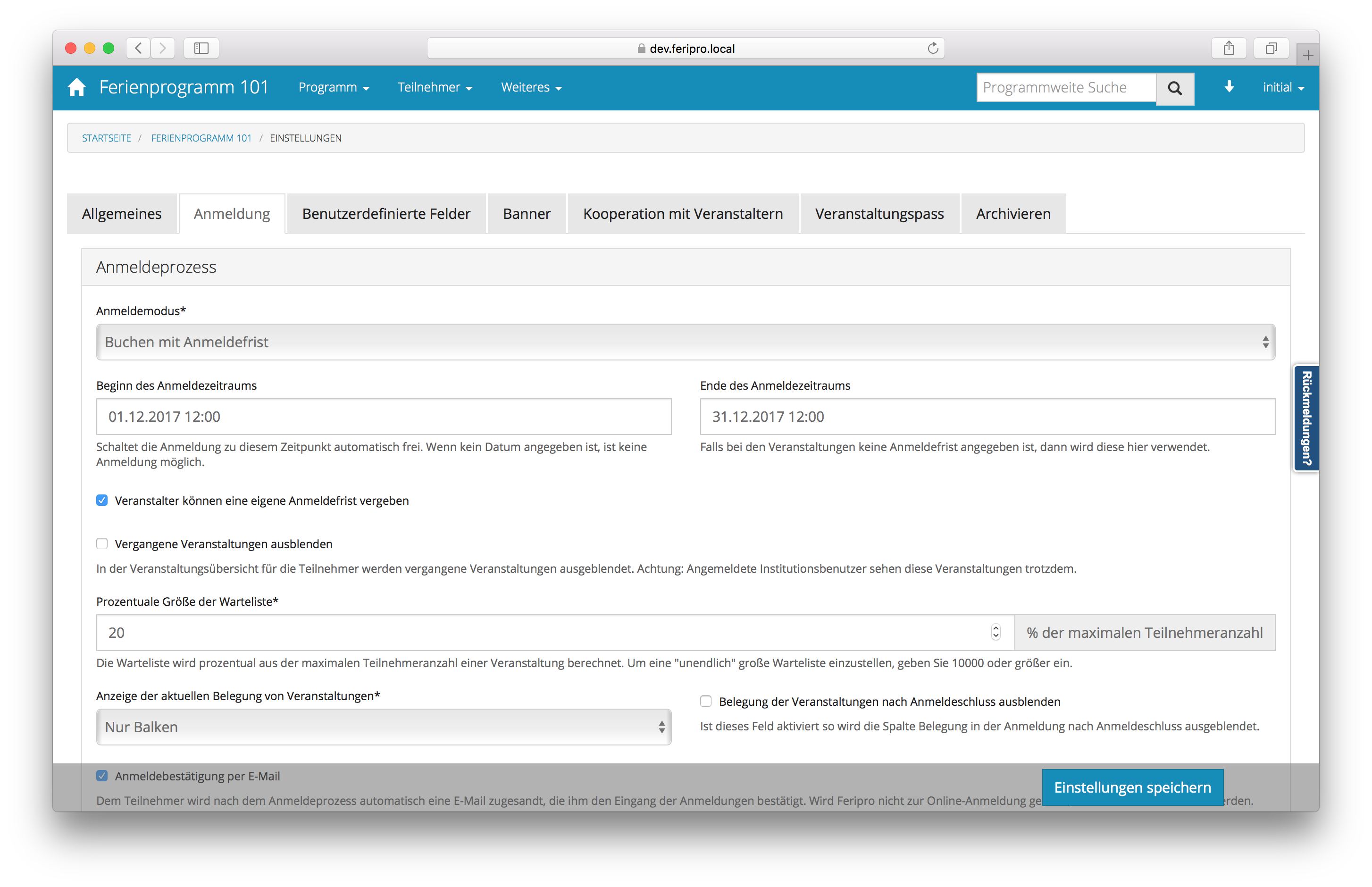 8. Den Anmeldezeitraum des Programms festlegen