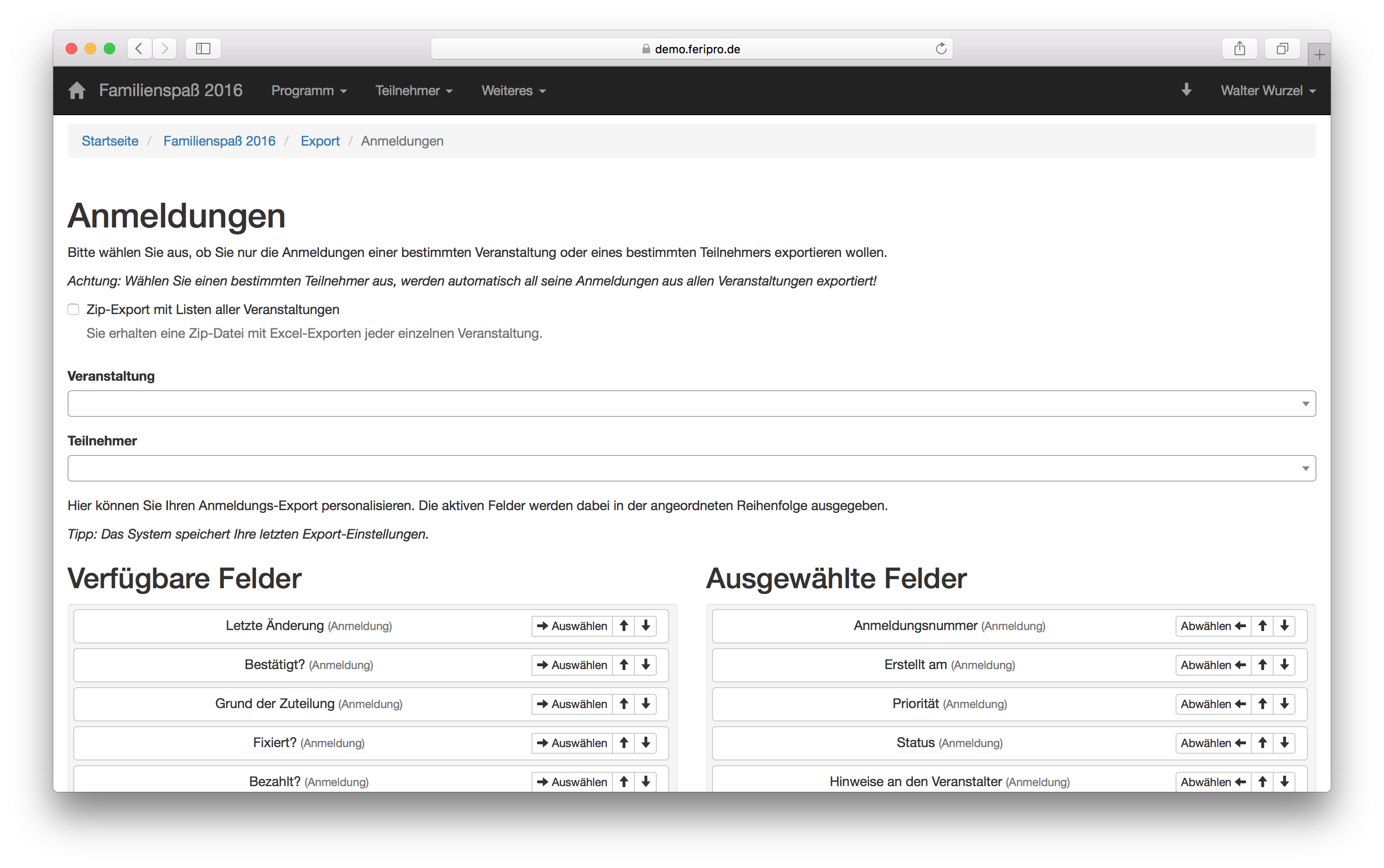 Hier können Sie die Daten aller Anmeldungen des Programmes, eines einzelnen Teilnehmers oder einer Veranstaltung exportieren.