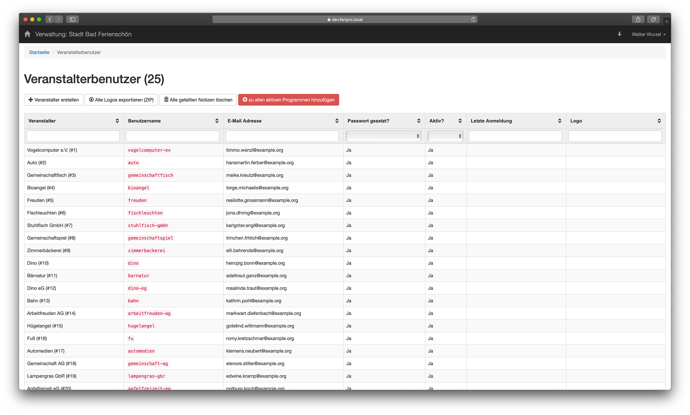 Über die Schaltfläche Zu den Veranstalterbenutzern auf der Verwaltungsstartseite gelangen Sie zu allen Veranstaltern aller Programme.